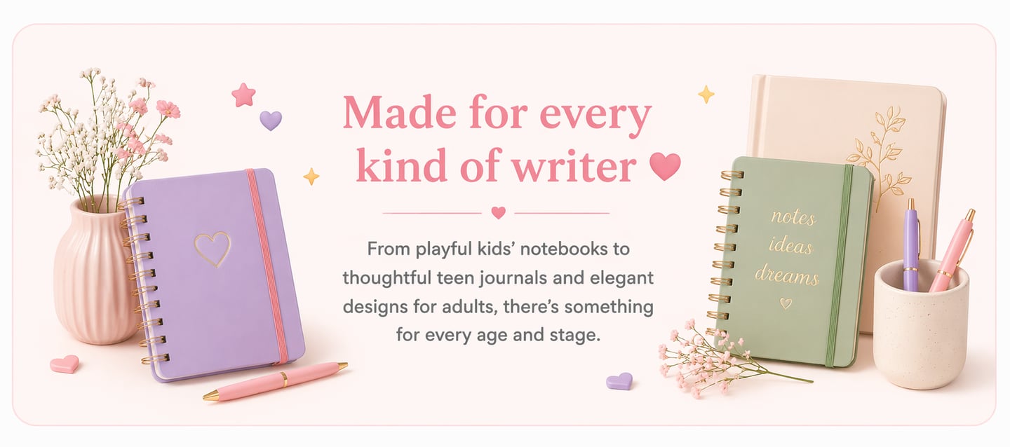Creative writing journals and stationery on a pink desk with flowers and coffee.